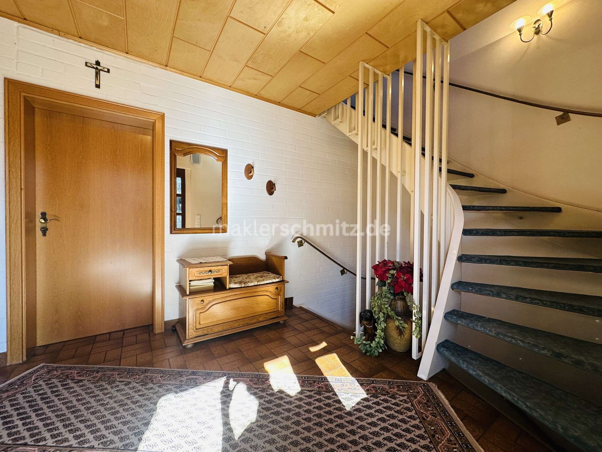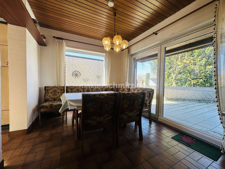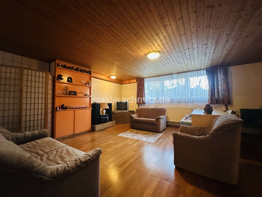 Der Wohnbereich bietet Zugang zur Terrasse, die sich für Aufenthalte im Freien in den wärmeren Monaten eignet. Das Haus ist zudem vollständig unterkellert und verfügt dadurch über zusätzlichen Stauraum sowie weitere Nutzungsmöglichkeiten, etwa für Hobbyräume oder eine Waschküche.