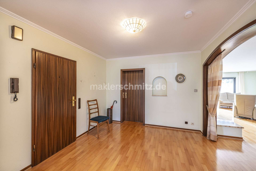 Die Obergeschosswohnung überzeugt ebenfalls durch eine großzügige und durchdachte Aufteilung. Vom zentralen Flur aus erreichen Sie alle Räumlichkeiten dieser Etage. Der Wohnbereich bietet ein helles Wohnzimmer mit direktem Zugang zur großen Dachterrasse – ein idealer Ort zum Entspannen und Genießen sonniger Tage.