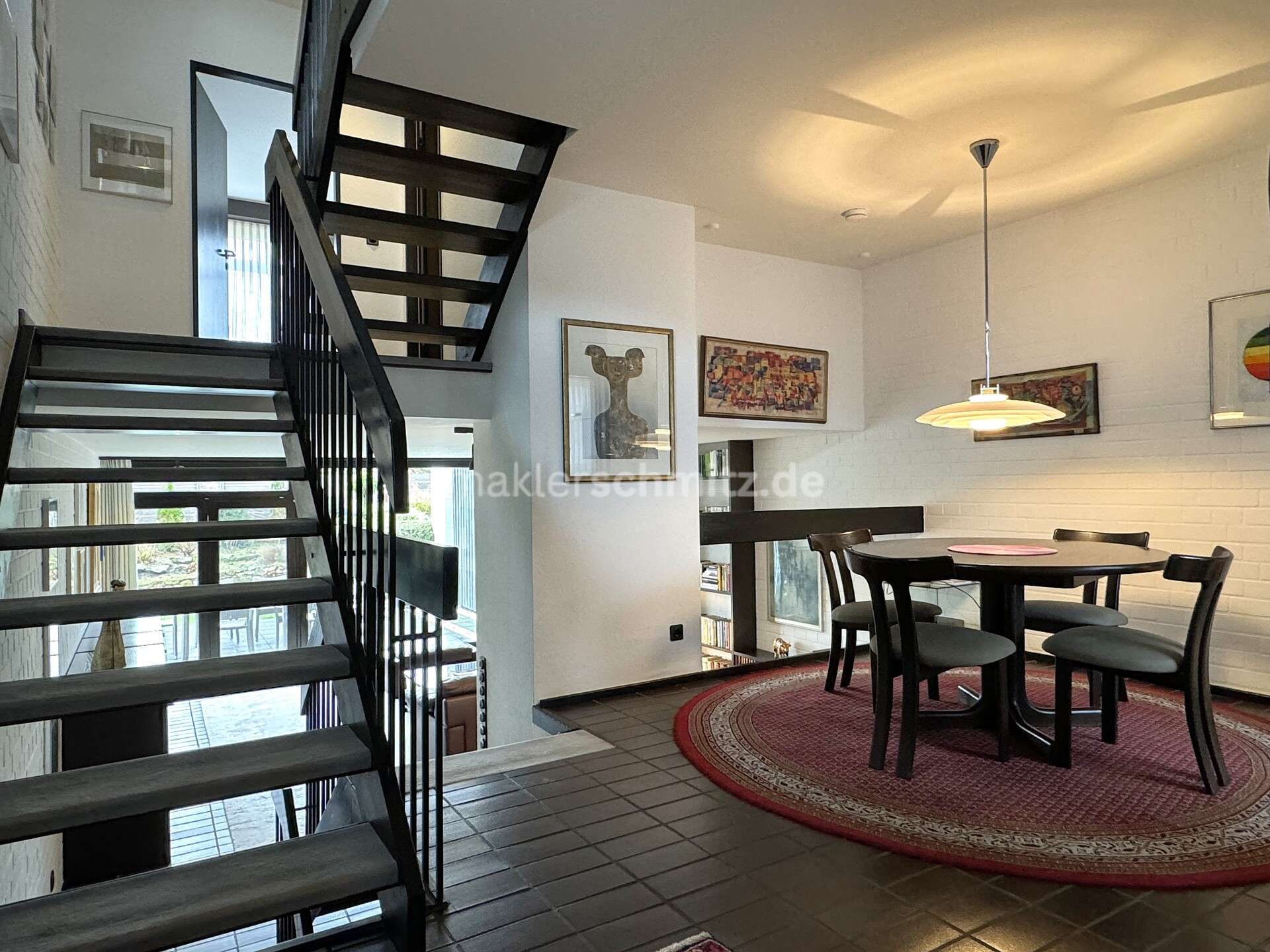 Das Haus erstreckt sich über mehrere Halbgeschosse und besticht durch eine interessante Architektur sowie eine durchdachte Raumaufteilung. Bereits beim Betreten gelangen Sie in einen offenen Hausflur mit Treppenanlage, der dem Objekt eine moderne und großzügige Wirkung verleiht.