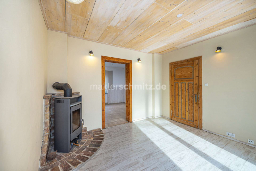 Der Wohnbereich ist mit einem Kamin ausgestattet. Von hier aus besteht Zugang zu der im Jahr 2023 überdachten Terrasse mit Südausrichtung.