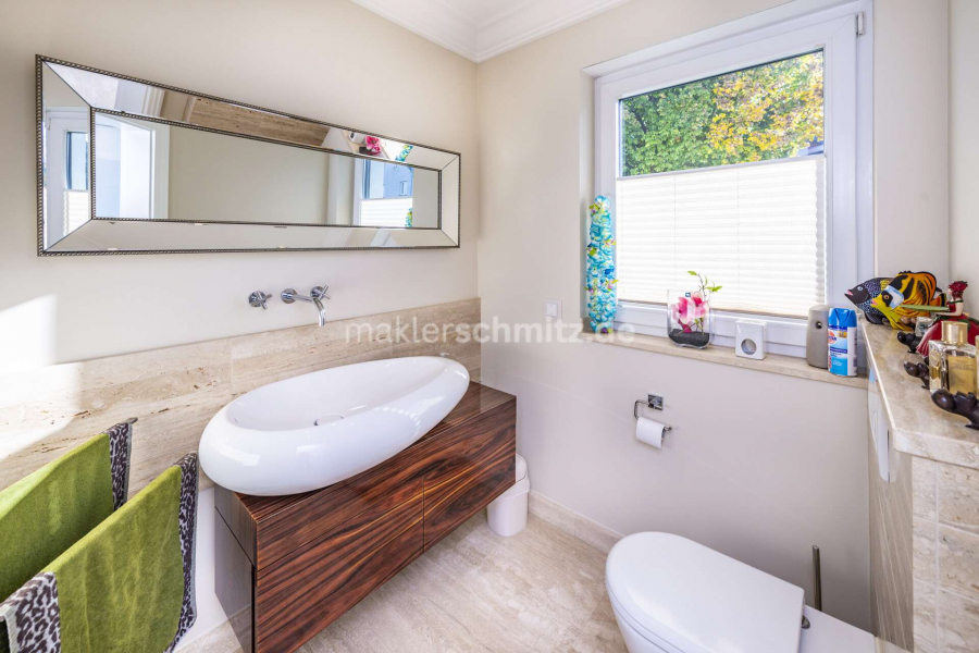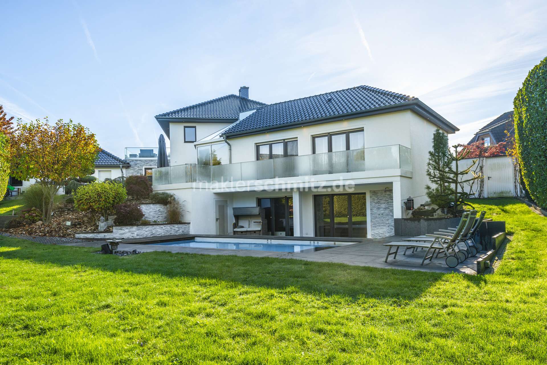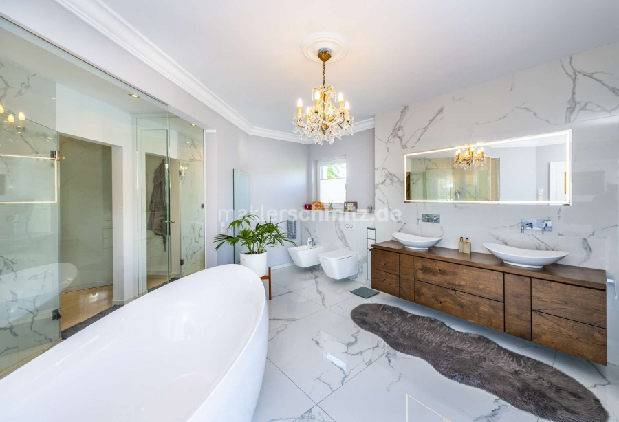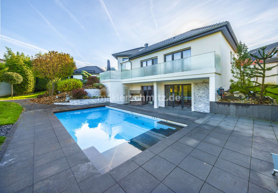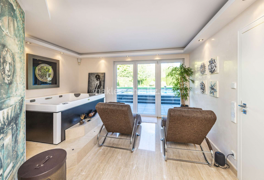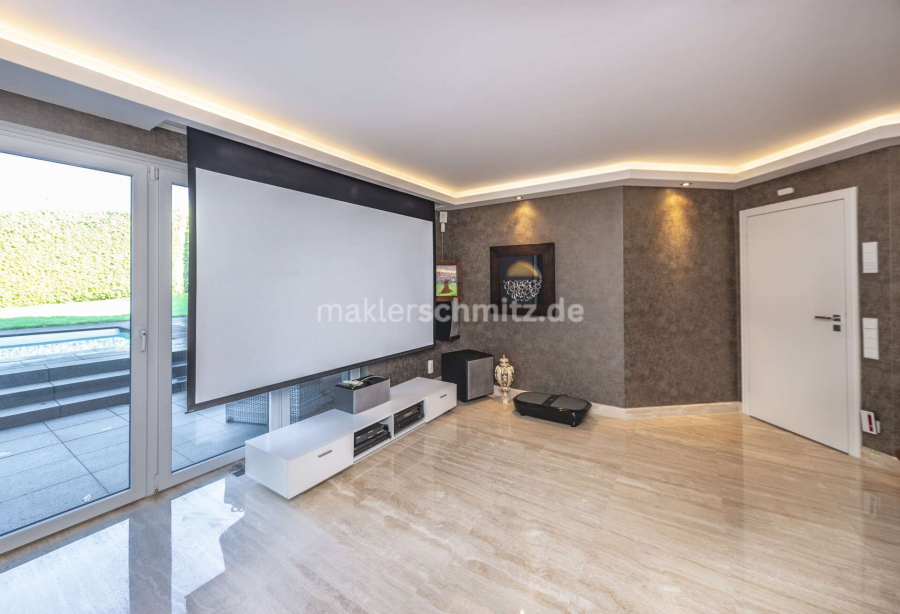 Ein besonderes Highlight stellt das Untergeschoss dar: Hier befindet sich ein repräsentatives Heimkino, das ideale Voraussetzungen für private Filmabende bietet. Der exklusive Wellnessbereich mit Sauna und Whirlpool lädt zur Entspannung ein. Ergänzt wird dieses Angebot durch die im Jahr 2015 angelegte Poolanlage, die an warmen Tagen Erfrischung und Urlaubsflair im eigenen Zuhause ermöglicht.