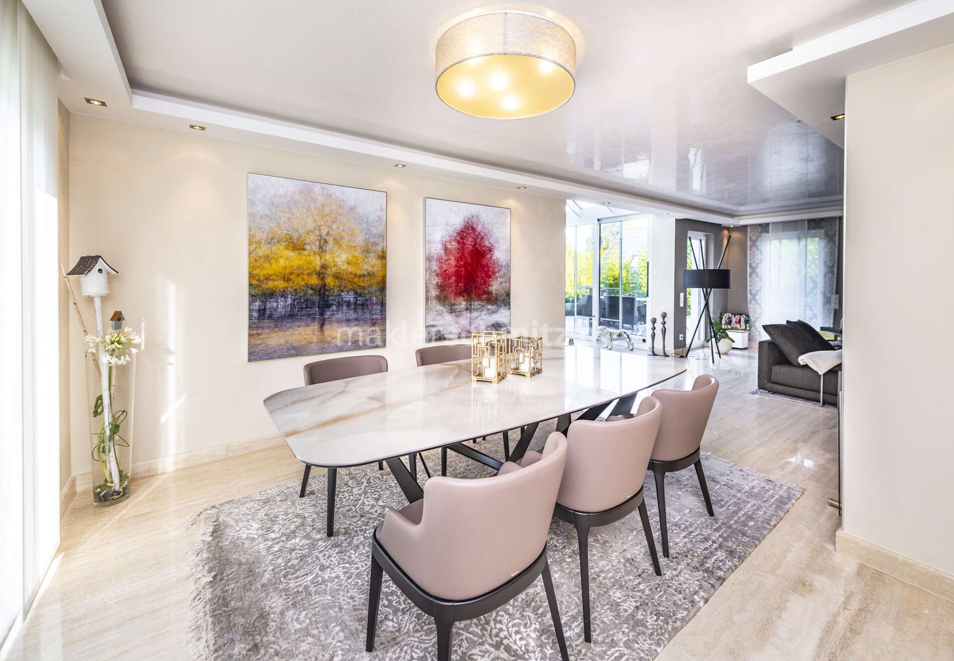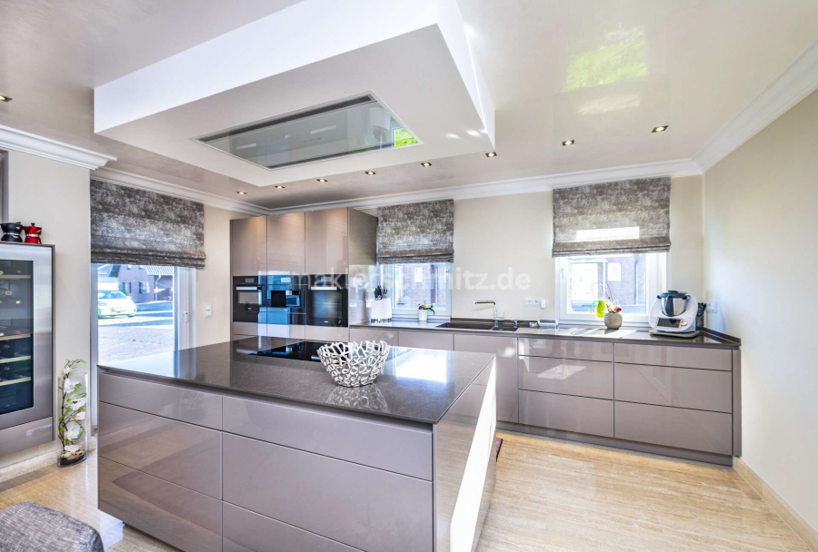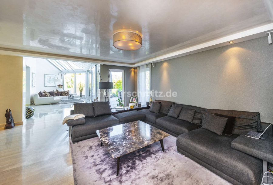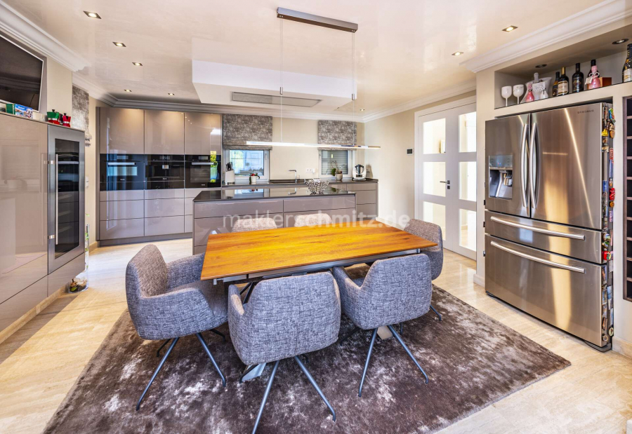 Das Herzstück des Erdgeschosses bildet die maßgefertigte Designerküche, die mit hochwertiger Ausstattung, edlen Materialien und großzügigen Arbeitsflächen keine Wünsche offenlässt. Angrenzend eröffnet der Wintergarten mit Schwebetüranlage einen fließenden Übergang zur Terrasse und schafft einen lichtdurchfluteten Raum zum Entspannen.