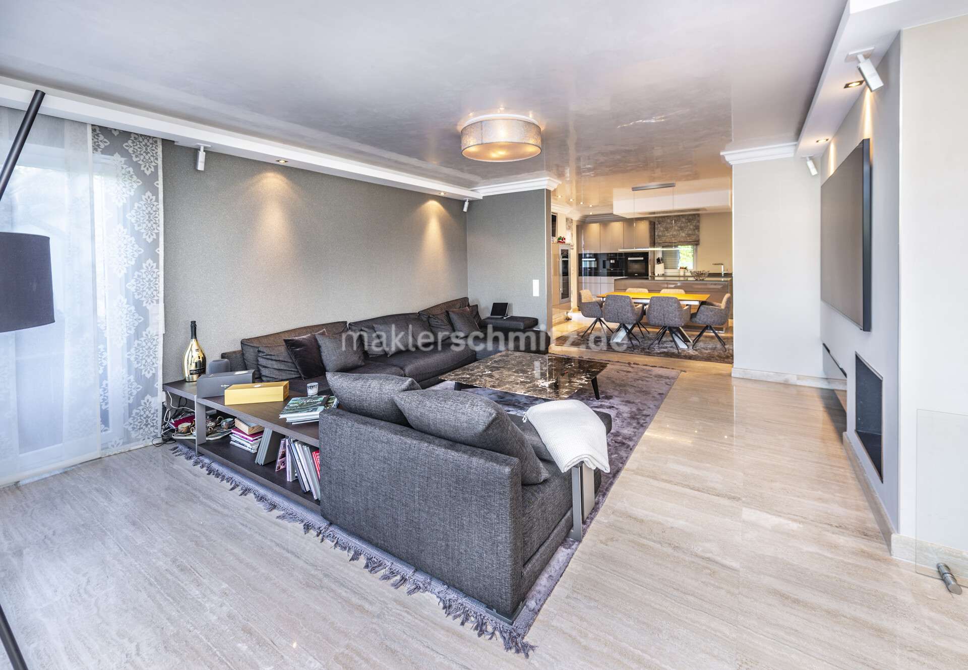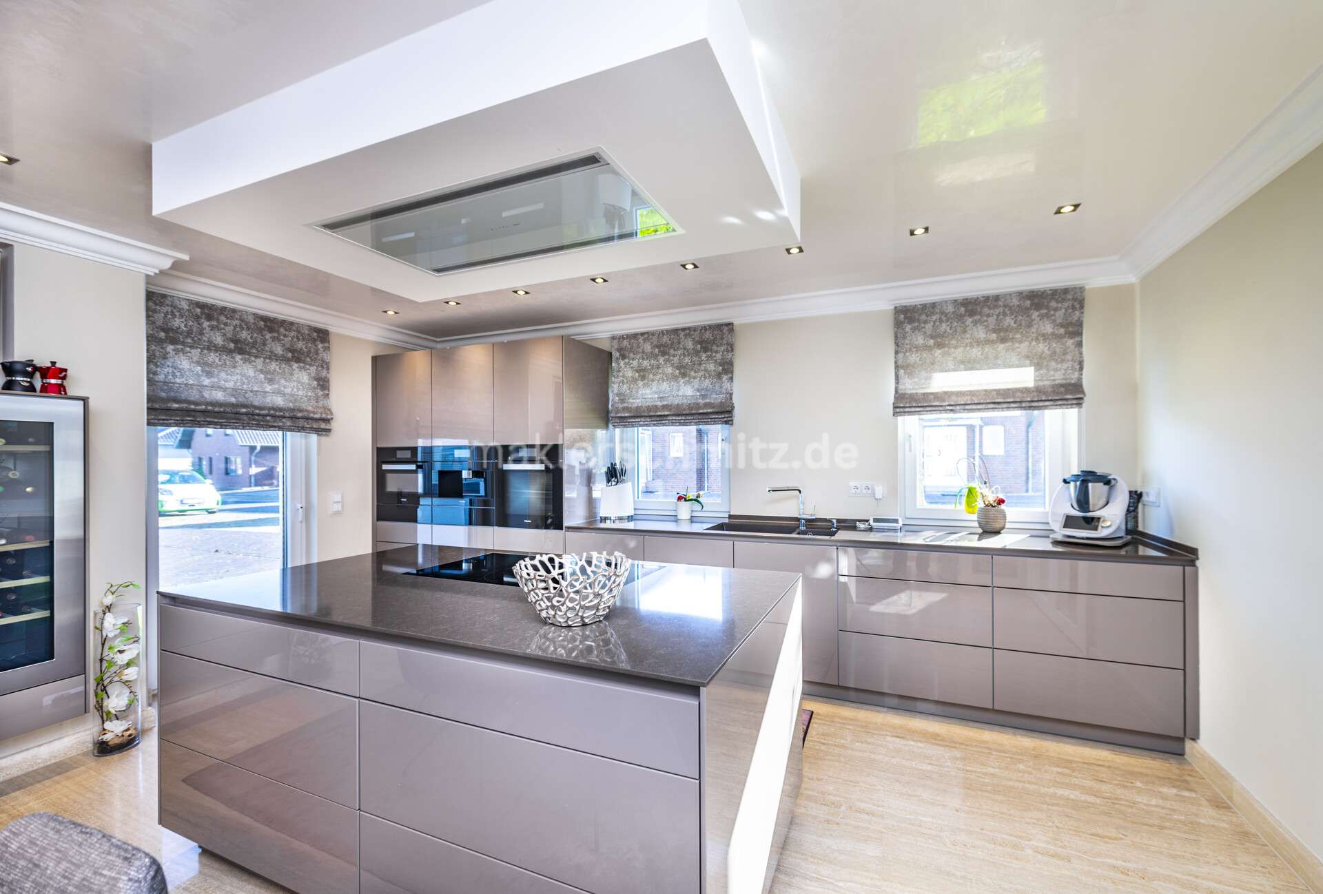 Die edle Designer-Einbauküche verfügt über integrierte Miele-Elektrogeräte und einen Liebherr Weinkühlschrank sowie eine Samsung Side-by-Side-Kühl-Gefrierkombination.