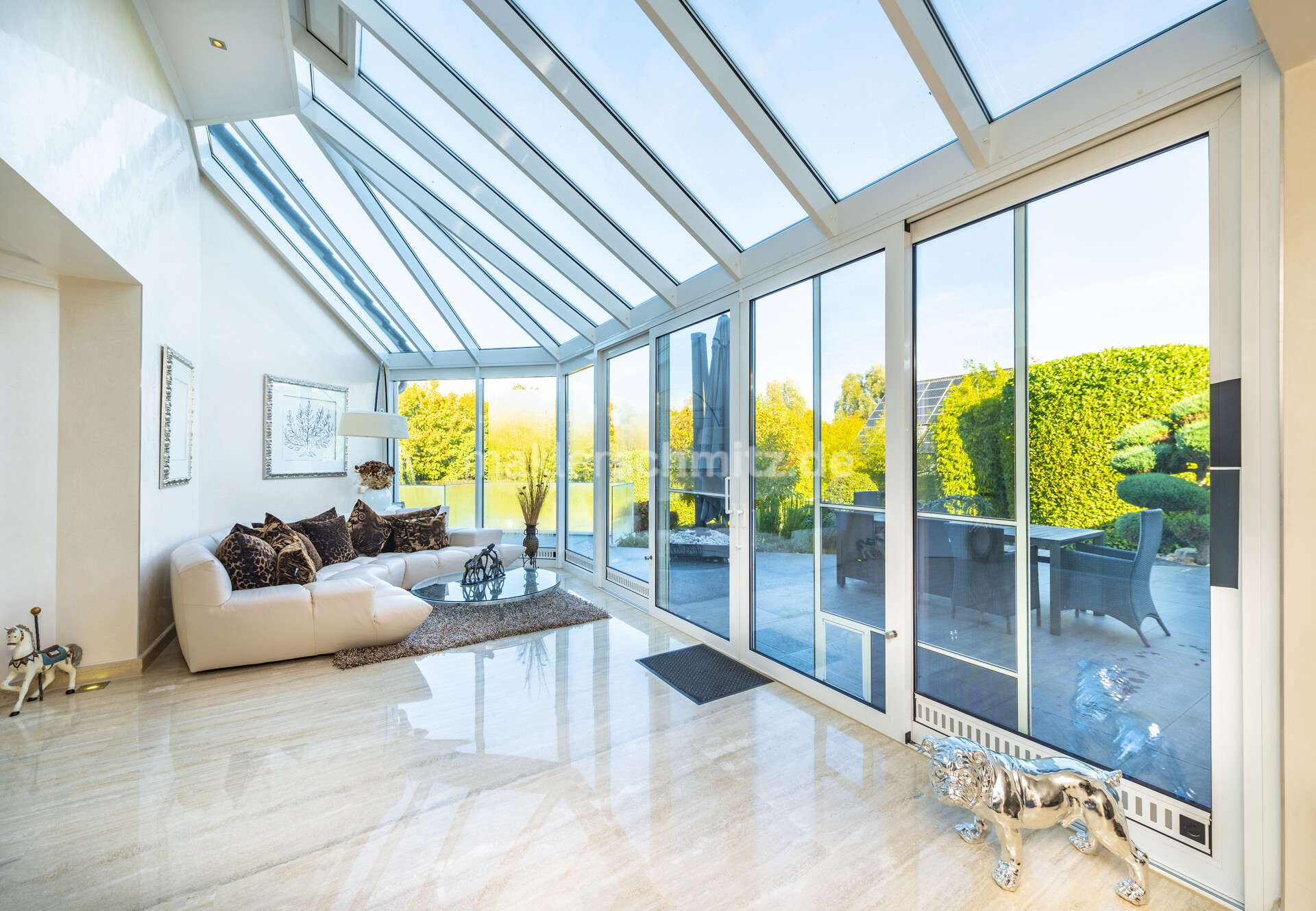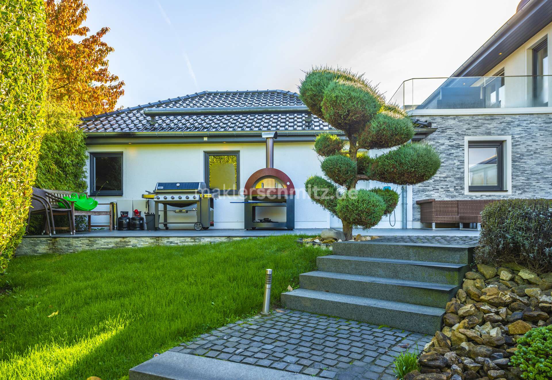 Eine hauseigene Zisterne sorgt für die Gartenbewässerung. Ein Wintergarten mit Schwebetüranlage für Luftzirkulation und Deckenspots bietet einen gemütlichen Rückzugsort.