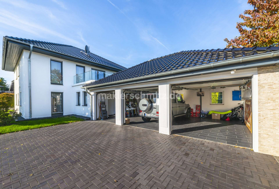 Abgerundet wird dieses außergewöhnliche Anwesen durch eine übergroße Garage mit Platz für drei Fahrzeuge sowie mindestens drei weitere Außenstellplätze.
