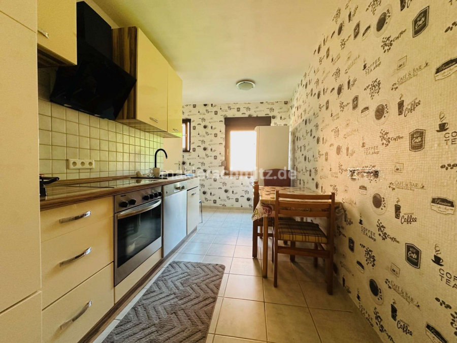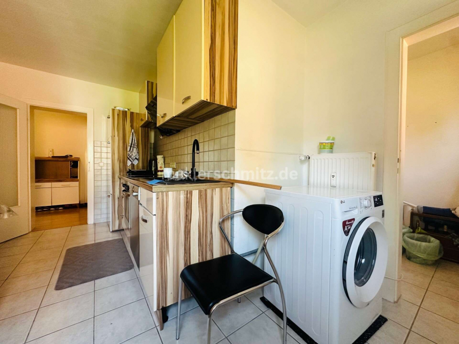 Die Küche verfügt über einen praktischen Abstellraum, der zusätzlichen Stauraum schafft, sowie einen Waschmaschinenanschluss. Das Badezimmer ist funktional gestaltet und komplettiert das Raumangebot.