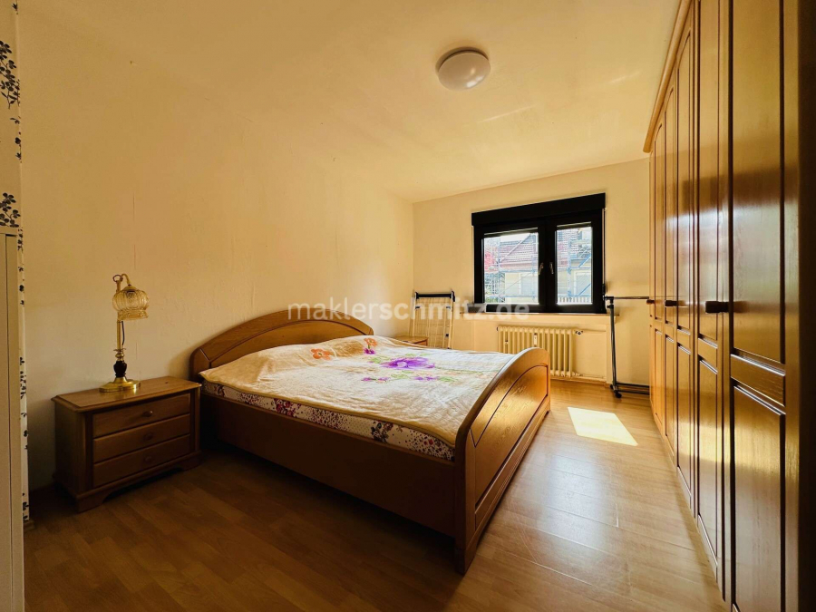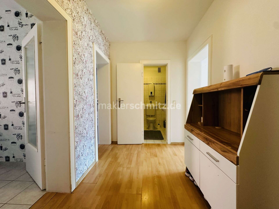 Über den zentralen Flur erreichen Sie bequem alle Räume der Wohnung. Das helle Wohnzimmer lädt zum Entspannen ein und bietet ausreichend Platz für eine gemütliche Sitzecke. Das Elternschlafzimmer punktet mit einer angenehmen Größe, während das zusätzliche Kinderzimmer flexibel als Büro oder Gästezimmer genutzt werden kann.